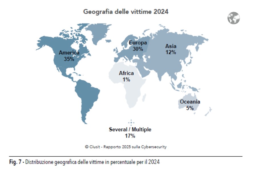 Nel 2024, la distribuzione geografica degli "incidenti rilevanti" rileva come l'Europa si sta confermando come target primario insieme agli USA.